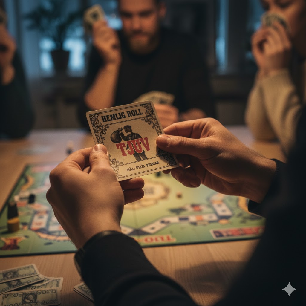 Rollerna delas ut hemligt, vilket skapar bluffmoment.